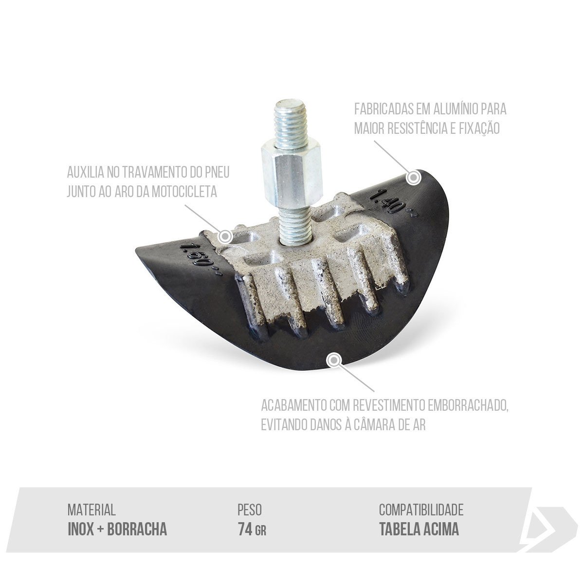 Auxilia no travamento do pneu junto ao aro da motocicleta.